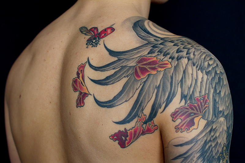 This is a large tattoo piece I’m currently working on with a hawk chest piece and full sleeve. I designed it as a grey wash with only the leaves in colour and I’m really happy with how it’s coming along.